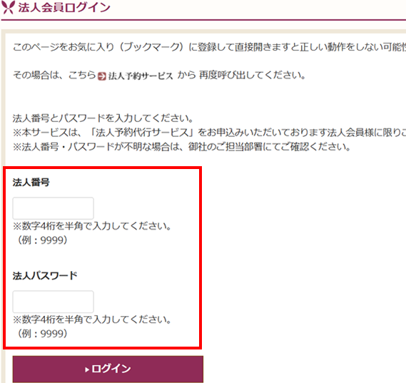 「オンライン予約」のボタンから予約ページに移動、法人番号・法人パスワードを入力してください。
