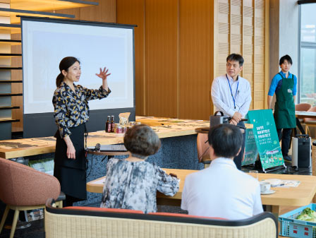ランチの後は次世代に続く森を守るための活動について紹介。箱根エリアの森を管理する箱根山組合の勝又さんによると、森は間伐しないと下草が生えず保水力を失ってしまうとのこと。そうなると大雨で土砂崩れなどの危険も。それを防ぐためにも保全が必要なのです。「箱根接待茶屋の森」では保水力を高めるために広葉樹を植えたり、木道の整備など森に親しんでもらうための取り組みも。今回のイベントが、森の大切さを知るよいきっかけになりました。