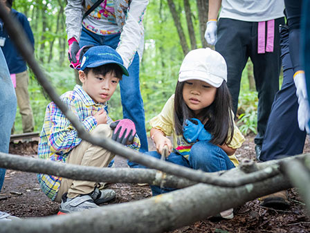親子で感じた森の大切さ作業を再開し、ツリーハウスの屋根やブランコをつくります。大人も子どもも関係なく、それぞれが自分にできることを見つけて、自然と動くようになります。ついに、みんなのヒミツキチが完成!何度もツリーハウスに登っては、満面の笑顔を見せる子どもたち。間伐から始まり、木を運び、持ち上げて、試行錯誤を重ねながら協力して作り上げたツリーハウス。自然の木にたくさん触れ、森を身近に感じ、好きになることが、「この森をずっと守りたい」という環境保全の気持ちにつながっていくのではないでしょうか。