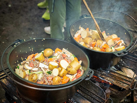 本格焚き火料理子どもの頃に憧れたツリーハウスづくりに、童心にかえって土台を組む大人たち。最初はおそるおそるだった子どもたちも、すぐにロープの結び方を覚え、ツリーハウスに登るためのはしごを完成させてしまいます。大きなダッチオーブンからは、信州の夏野菜がたっぷりはいったカレーのいい香りが…。鉄鍋で炊いたご飯と焚き火で焼いたナンをそえた、森のランチは格別の味わいです。さまざまな種類のりんごジュースが用意され、好みの味を選べたのも、りんごの産地ならではの楽しみでした。