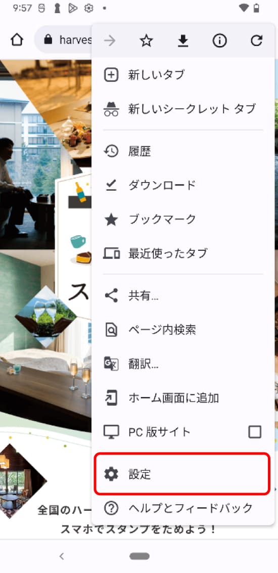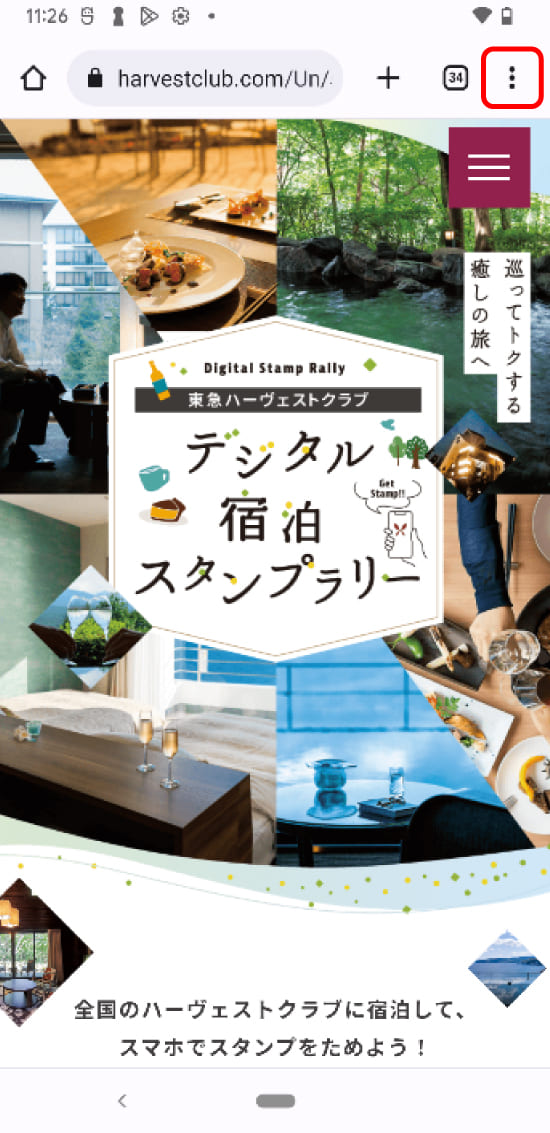 続いてChromeでハーヴェストクラブデジタル宿泊スタンプラリー特設サイトを開き、「アドレスバーの︙の部分」をタップします。
