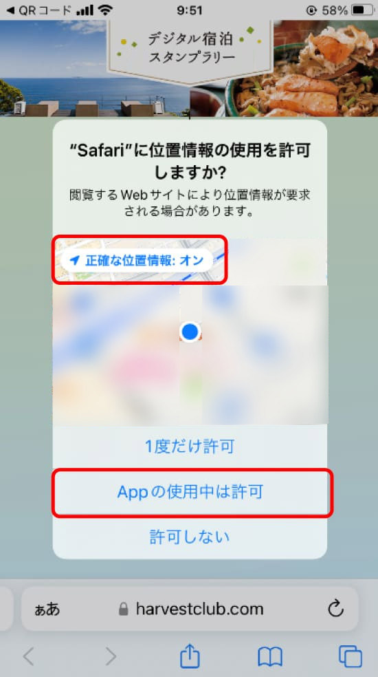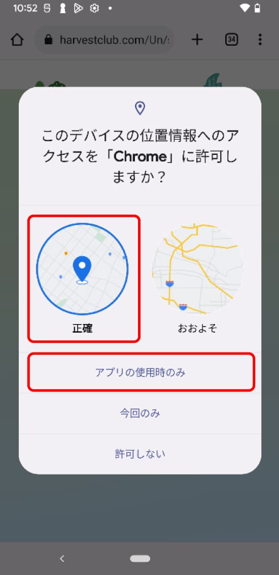 こちらのようなポップアップが表示された場合は、「正確な位置情報:オン」にし、「Appの使用中は許可」をタップします。