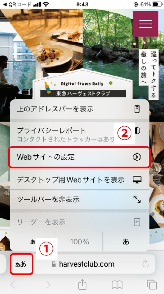 続いて、Safariでハーヴェストクラブデジタル宿泊スタンプラリー特設サイトのWebサイトを開き、「アドレスバーの①の部分」→「 ② Webサイトの設定」の順にタップします。