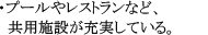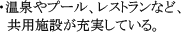 - 温泉やプール、レストランなど、共用施設が充実している。