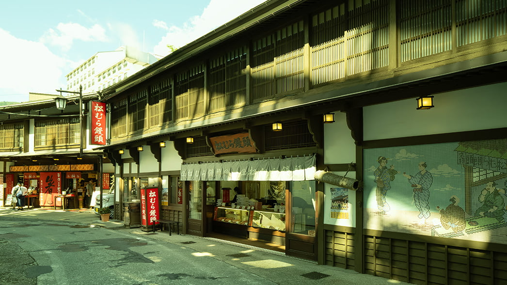 にぎやかな通りを進んだ右手、湯畑から約100mの場所にあるのが、老舗の「松むら饅頭」。1945年の創業から約80年間変わらぬ製法で作られる温泉饅頭は、食べ歩きにもぴったりの草津名物です。