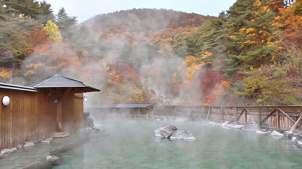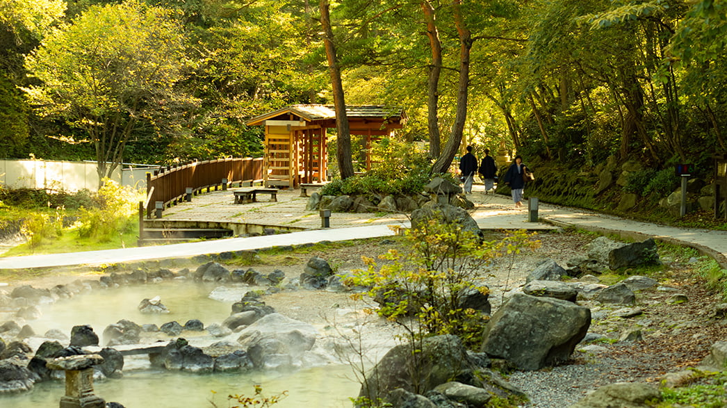 公園の中ほどにあるのが、圧倒的な開放感のなかで贅沢な時間を享受できる「西の河原露天風呂」です。近くにはスキー場もある緑豊かな自然の中に造られた露天風呂は、男女合わせると約500㎡にもおよぶ広大なスケール。周囲の木々が赤や黄色に色づく秋には紅葉を眺めながら、冬には雪見露天、夜にはライトアップされた幻想的な空間のなか、肌触りのなめらかな自慢の名湯を堪能できます。