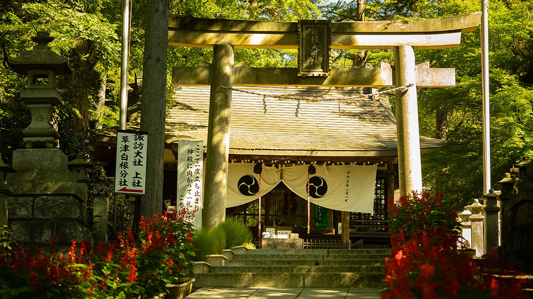 公園を出たら、少し足を延ばしてパワースポットとしても評判の「白根神社」にも立ち寄りましょう。西の河原通りの「草津ホテル別館」がある三つ角を左に曲がり、しゃくなげ通りへ。東方向に進み、5分ほど歩くと歴史ある神社が見えてきます。温泉街を見下ろす高台に位置する見晴しのいい境内には、かつて草津の湯を発見したと伝えられる日本武尊を祭神とした本殿に加え、沼神社、諏訪神社、三峯神社の4つの神社が点在。厳かな空気が流れる緑豊かな敷地内を歩けば、悠久の時間を感じられるはずです。シャクナゲの名所としても知られ、天皇陛下即位30年記念碑のほか、松尾芭蕉や十辺舎一九、高村高太郎らの碑も設置されています。