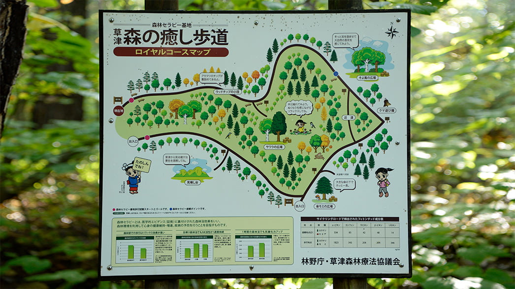ロイヤルコースは、緩やかな約1300メートルの周回コース。起伏も緩やかで距離も短いので、のんびりと散策できるのも特徴です。草津は”森林浴博士“として名高い神山恵三氏が、リラックス効果をもたらすと言われる成分『フィトンチッド』を日本で初めて測定したところでも知られています。