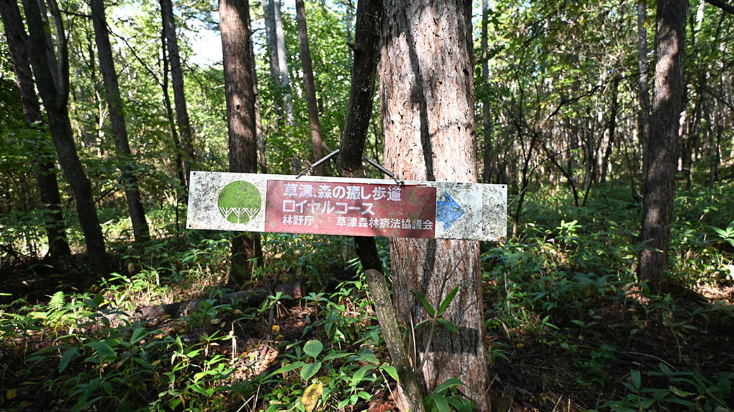 草津温泉に隣接する国有林を「草津森の癒し歩道」として整備されている自然歩道があります。「ロイヤルコース」「サイクリングコース」「やすらぎの森コース」の3つのコースのうち、天皇皇后両陛下(現在の上皇、上皇后両陛下)が散策された際にお褒めいただいたことをきっかけに名付けられた「ロイヤルコース」は、カラマツ林を主体として、多くの樹種が共生している森林に、アカマツのウッドチップが敷かれた癒しのコースです。今回、ロイヤルコースを実際に歩いてみて、癒しの時間にひたりました。