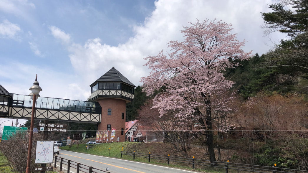 温泉街の入り口・草津温泉門から徒歩5分の場所にある「道の駅 草津運動茶屋公園」では、4月下旬から5月上旬にかけて、平地ではすでに散ってしまったソメイヨシノに代わり、淡いピンク色のオオヤマザクラが待ちわびていたかのように咲き誇ります。花びらが高原の風に吹かれ、舞い踊っているかのような華やかな景色は、まさに草津からの春の贈り物です。