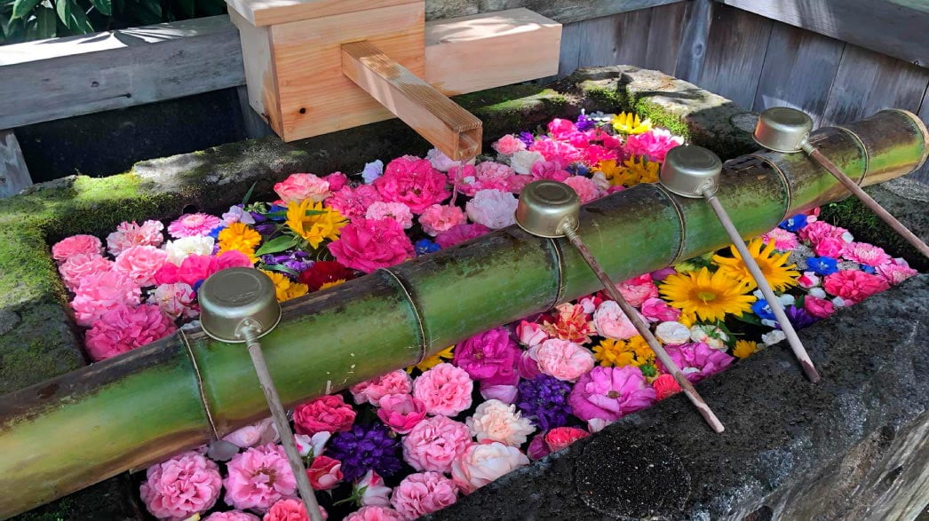草津温泉の中心地から徒歩5分ほどのところにある「白根神社」では、5月に入ると「花手水」が参拝者を迎えてくれます。通常の手水鉢に季節の花を浮かべた花手水は、訪れる人の手だけでなく、心まで清めてくれる美しさです。