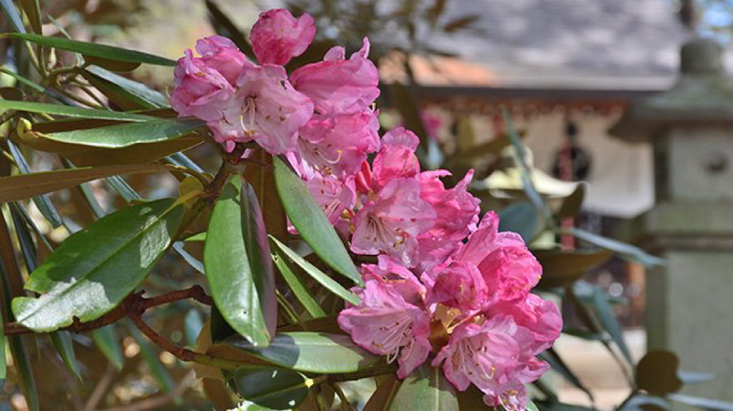 また草津町の町花であるアズマシャクナゲの名所としても知られており、5月上旬になると境内が濃いピンク色の花々で彩られます。木々の隙間から差し込むやわらかな光に照らされてアズマシャクナゲがきらめき、神社という神聖な空間が一段と神々しい印象に。喧騒から解き放たれて境内を巡るうちに、体の細胞のひとつひとつが洗われていくような感覚で満たされていきます。から解き放たれて境内を巡るうちに、体の細胞のひとつひとつが洗われていくような感覚で満たされていきます。