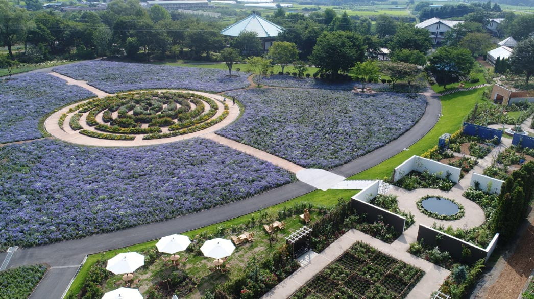 時間に余裕があれば、草津温泉に向かう途中で訪れたいのが「中之条ガーデンズ」。関越自動車道 渋川伊香保ICから車で約50分のところに位置し、約12万平方メートル、東京ドーム2.5個分もの広大な敷地に、ガーデンデザイナー・吉谷桂子氏が手掛ける「スパイラルガーデン」など、7つの庭とファームエリアが広がります。