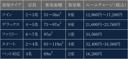 | お部屋のタイプ | 定員 | 広さ | 室数 | |