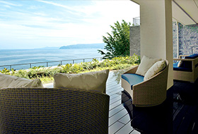 ホテルは緑豊かな高台に位置し、目の前には大きく広がる青い海。