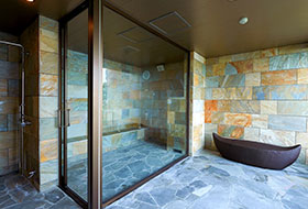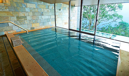 内湯と広大な海と伊豆山の豊かな緑を目線の高さで眺めながら、のんびりと温泉につかることのできる露天風呂をご用意。