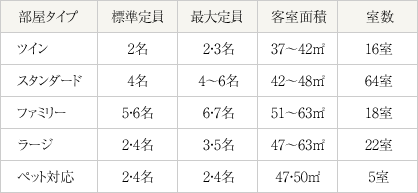 | お部屋のタイプ | 定員 | 広さ | 室数 | |