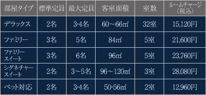 | お部屋のタイプ | 定員 | 広さ | 室数 | |