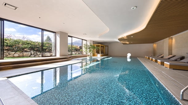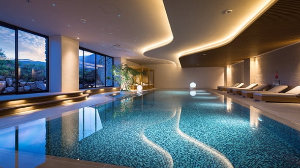 温泉をつかった屋内プール。昼は青いモザイクタイルが水面にきらきらと反射し、夜は星空をイメージした光ファイバー照明で、くつろぎのシーンを演出します。プールサイドにはお身体を心地よく温めるサーマルルームもご用意しております。