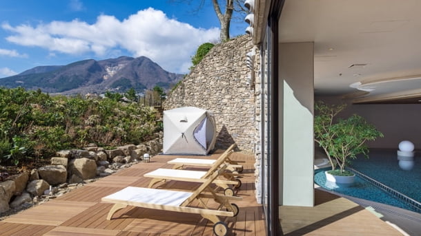 プールからつながるウッドデッキは、雄大な箱根の山々を眺めながら大自然の風を感じることができるスペース。開放感を贅沢に味わう「ととのいテラス」で思い思いにリラックスした時間をお過ごしください。