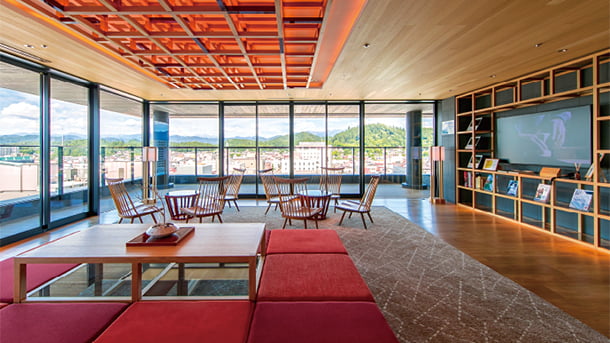 高山市内と北アルプスを一望できる9階展望ラウンジ。飛騨高山の文化・歴史などを紹介する書籍を揃えた読書コーナーもご用意しています。