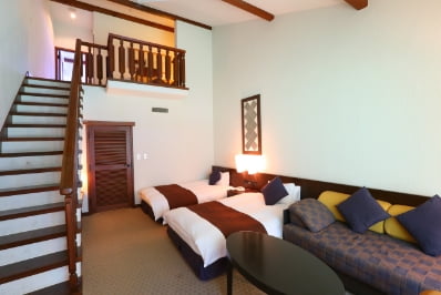別荘感覚でくつろげる2層吹き抜けのメゾネット客室もご用意。プライバシーと開放感を兼ね備えた、ゆとりと温もりを感じられる、ご家族、グループ向きの空間です。
